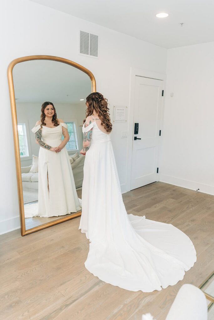 Editorial-style portraits look magazine-worthy in this room. Large mirrors make your detail shots absolutely stunning. Moreover, there’s plenty of room for your entire bridal party.