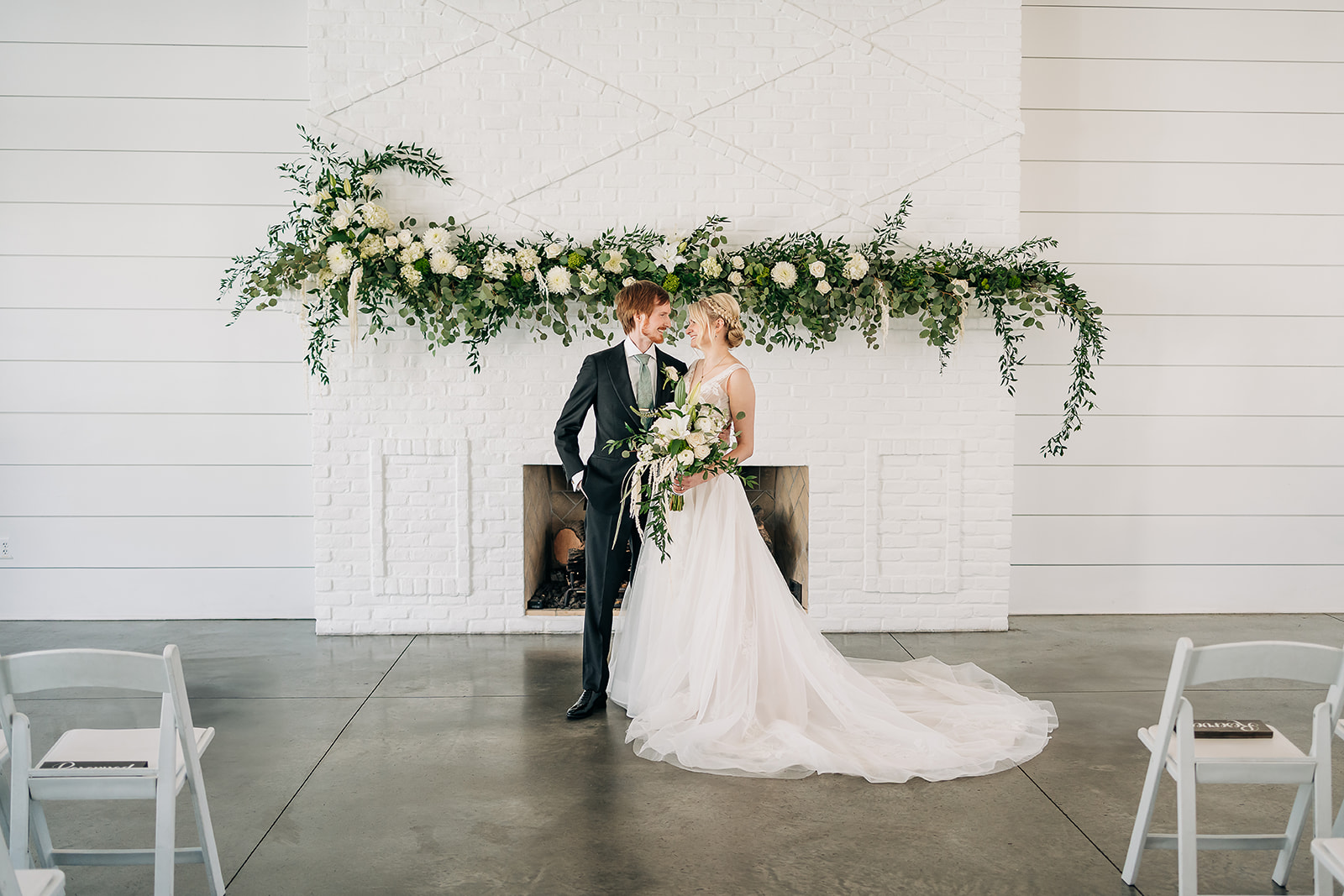 A secret garden retreat awaits in the outdoor courtyard. Manicured turf and complete privacy create intimate ceremony settings. In addition, the fenced-in space offers modern farmhouse charm.